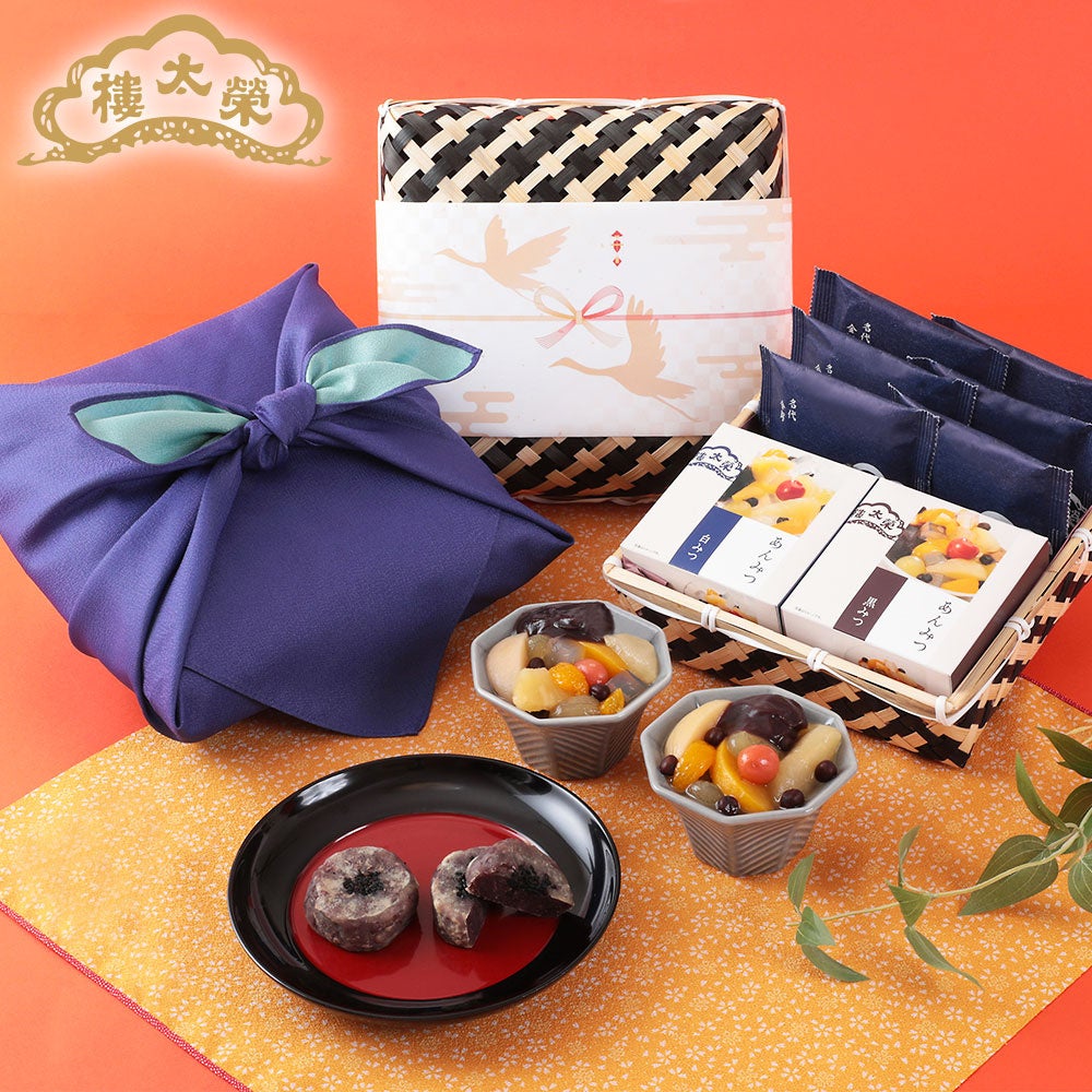 小豆本来のコクを活かした甘みが特徴の伝統の金鍔、本格派の味わいのあんみつを、手編みで作り上げた竹かごにお詰めし風呂敷でお包みいたしました。オンラインストア限定セットです。