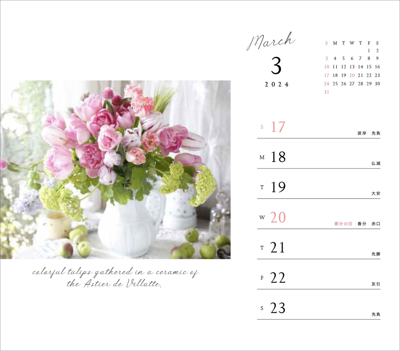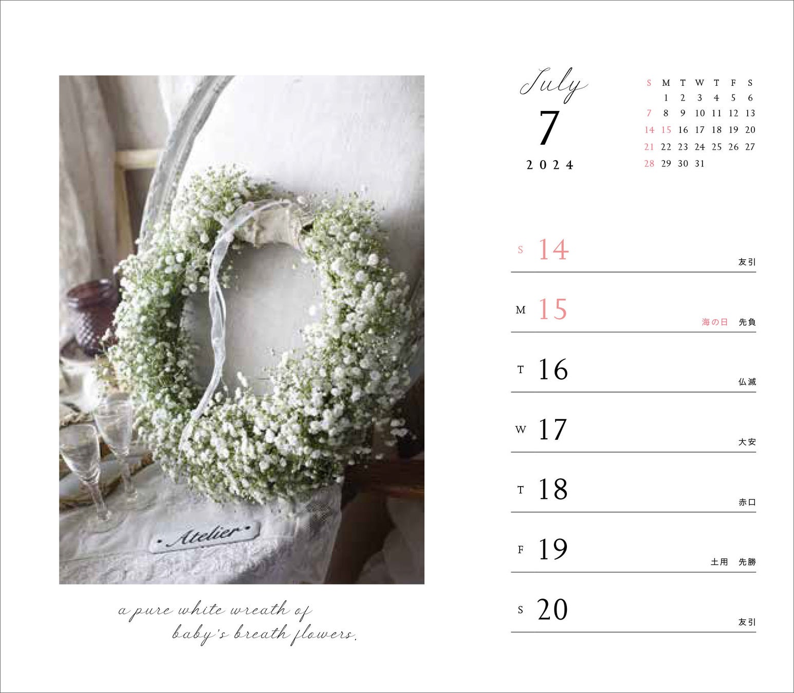 カレンダーや手帳が毎年大好評のフラワーデザイナー・水野麻紀さん。昨年版の好評を受け、2024年版の週めくりカレンダーが辰巳出版より発売されました。華やかなアンジメントからお洒落なリース、シンプルな一輪挿しまで、週替わりだからこそ楽しめるバラエティ豊かな花々が卓上を彩ります。