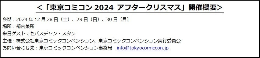 「日本に行くのをすごく楽しみにしていた。日本のファンにぜひ会いたい」との申し出を受け、東京コミコン側はセバスチャン・スタン氏本人と密に連絡を取り合い、話し合いを行った結果、12月28日(土)・29日(日)・30日(月)の3日間、都内某所にて「東京コミコン2024 アフタークリスマス」と銘打ちセバスチャン・スタン氏のサイン会・撮影会およびパーティを実施することとなりました!