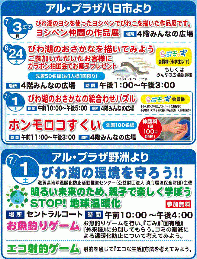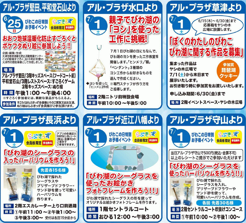 また、「びわ湖の日」の7月1日前後には、琵琶湖や滋賀県産など地元の食材を生かした商品の企画、地域の魅力ある商品のご紹介と積極的な販売、また、行政との連携によるお子様環境学習イベントの実施、琵琶湖に関連するお子様イベントを主催するなど、店舗で様々な企画を実施します。