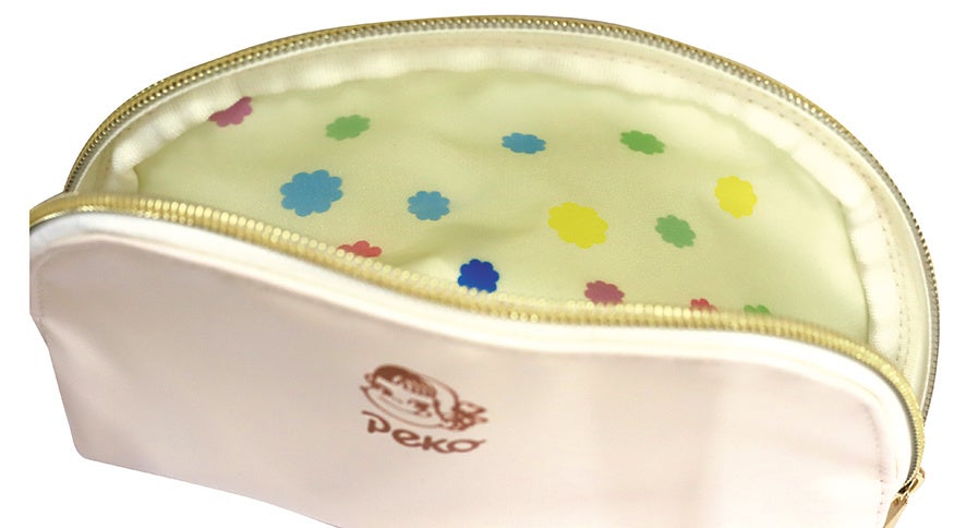 ペコちゃんと、ペコちゃんの舌をイメージした新しい不二家洋菓子店のマーク「スマイルマーク」が裏面にデザインされたポーチです。中にはミルキーフラワー柄がデザインされています。