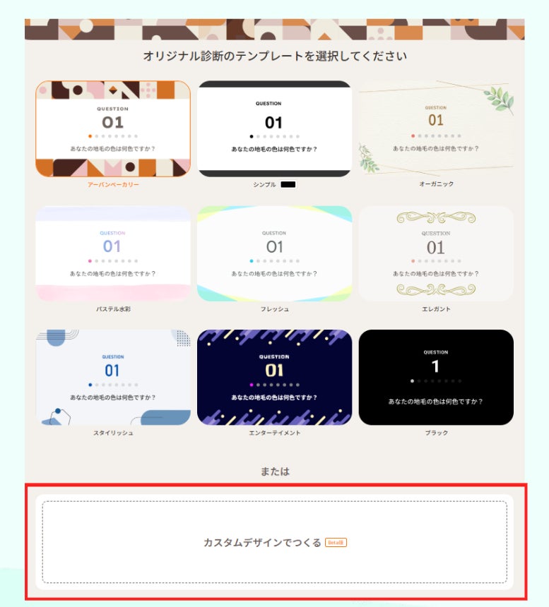 「デザインカスタマイズ機能 β 版」は、「オリジナル診断」「オリジナルガチャ」「アンケートコンテンツ」のいずれにも対応しております。