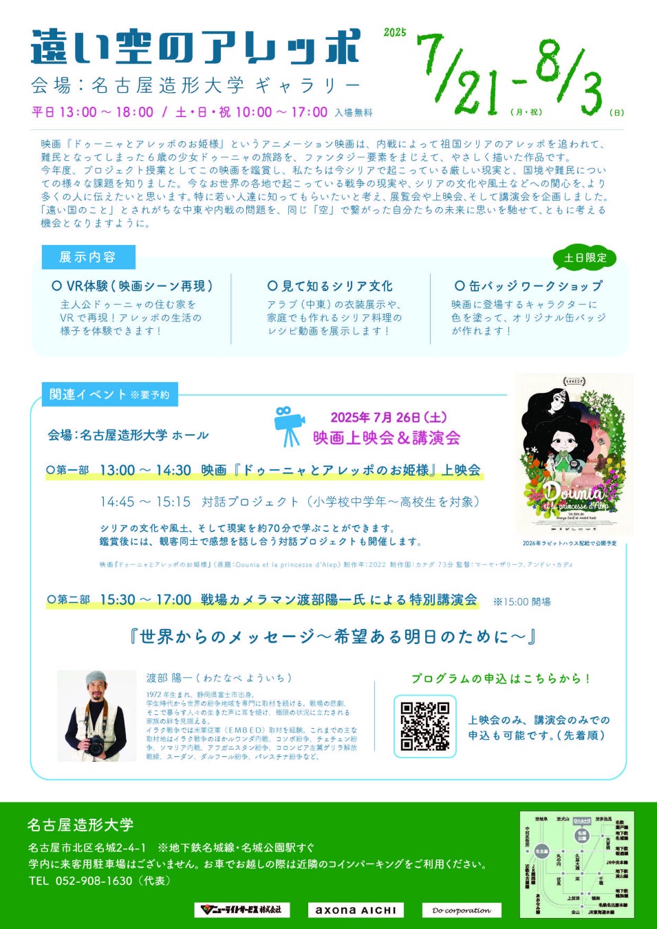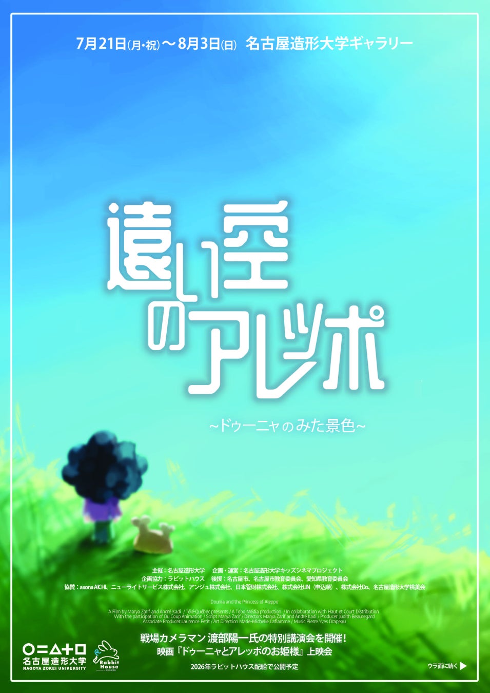 名古屋造形大学では2025年度特別企画展「遠い空のアレッポ」を7月21日(月・祝)より開催します。今年度、プロジェクト授業として、学生たちはアニメーション映画『ドゥーニャとアレッポのお姫様』と出会いました。これは、内戦によって祖国シリアのアレッポを追われて、難民となってしまった6歳の少女ドゥーニャの旅路を、ファンタジー要素をまじえて、やさしく描いた作品です。今、シリアで起こっている厳しい現実と、国境や難民についての様々な課題を知りました。今なお世界の各地で起こっている戦争の現実や、シリアの文化や風土などへの関心を、より多くの人に伝えたいと思い展覧会や映画上映会、そして講演会を企画しました。