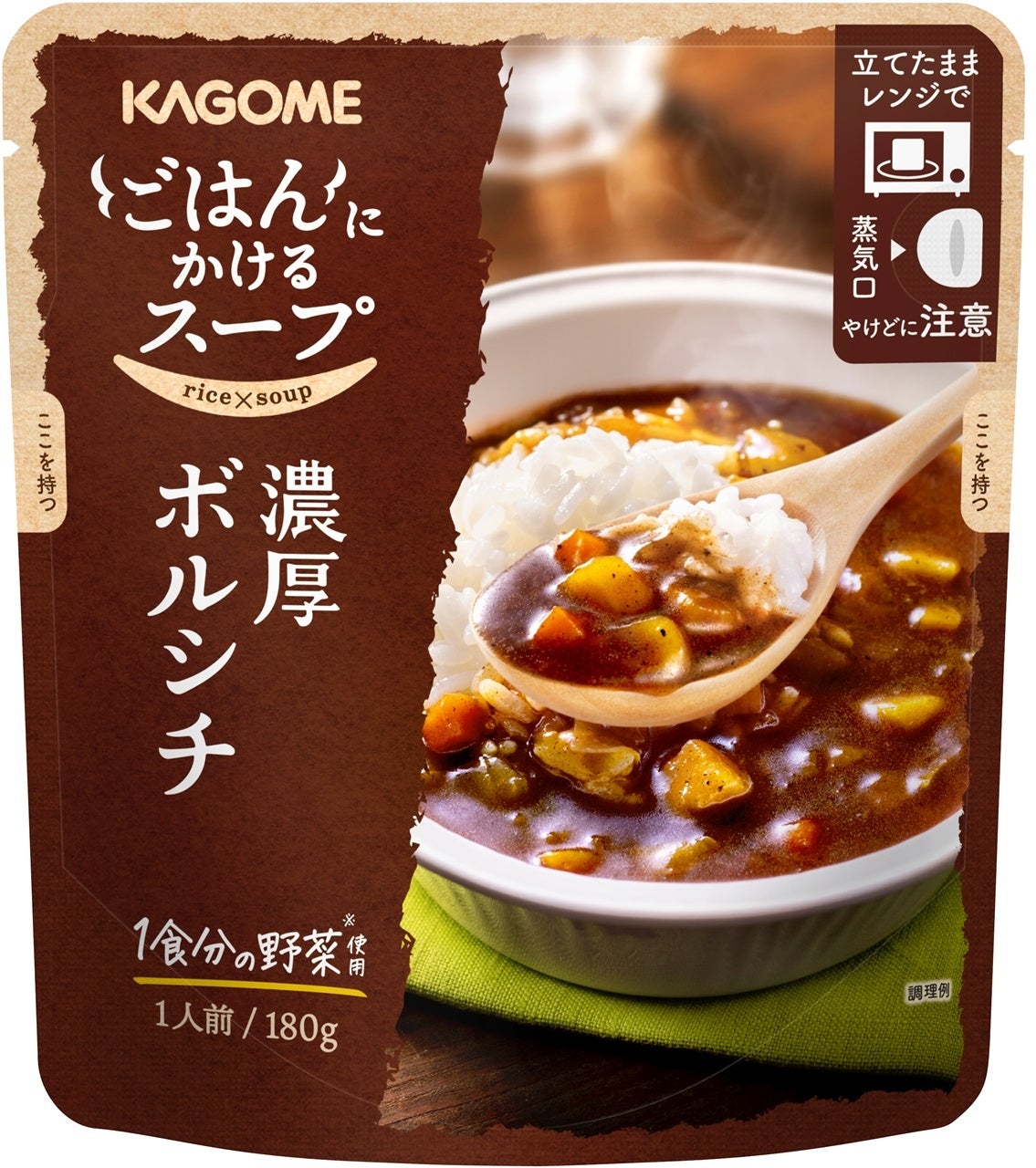 このたび発売する「ごはんにかけるスープ」は、特別な味わいと具材感が楽しめて、野菜をたっぷり使用(1食分の野菜※2[120g]を使用)した、ごはんにかける濃厚なスープです。“海老と完熟トマトのビスク”は、乳のコクや魚介・トマトなどのうま味が詰まった濃厚なビスクに、“濃厚ボルシチ”は、牛肉やトマト、たまねぎなどのうま味とコクが感じられる濃厚なボルシチに仕立てました。2品とも、常温でストックできる1食使い切りタイプで、レンジで袋のまま温め、ごはんにかけるだけで簡単な主食が作れます。常温でも冷やしても食べられます。また、パンと一緒に食べても美味しくお召し上げりいただけます。