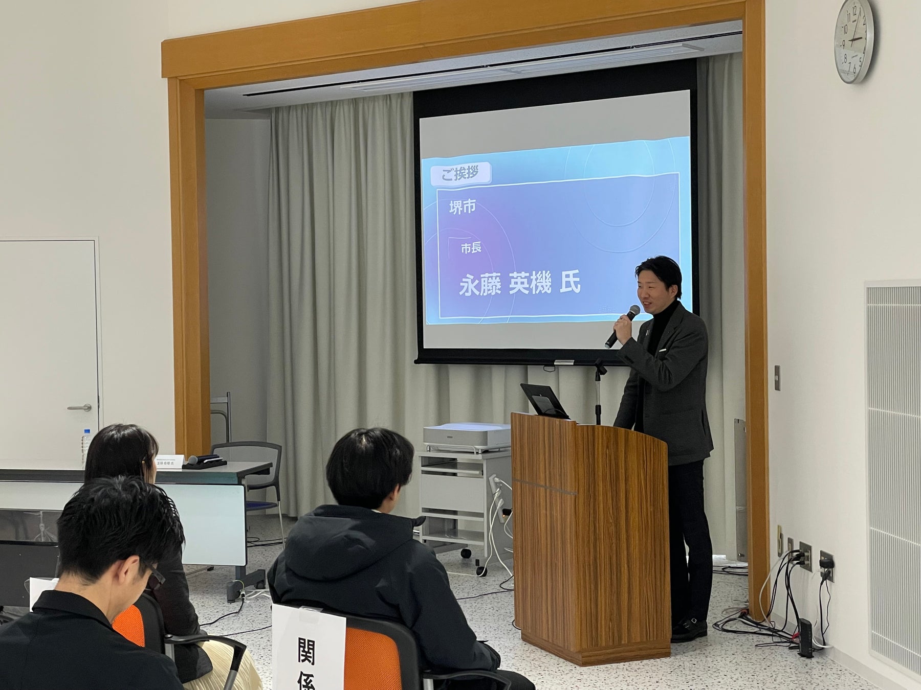 永藤英機堺市長の挨拶に始まり、社会課題の解決と持続可能な成長をめざす「ゼブラ企業」の支援に取り組んでいる株式会社Zebras and Companyの玉岡佑理氏の基調講演、堺市が取り組むイノベーション創出に向けた支援プログラムに参加している事業者5名によるピッチと続き、堺市から次年度に向けた施策紹介を行い、大盛況のうちに閉会しました。