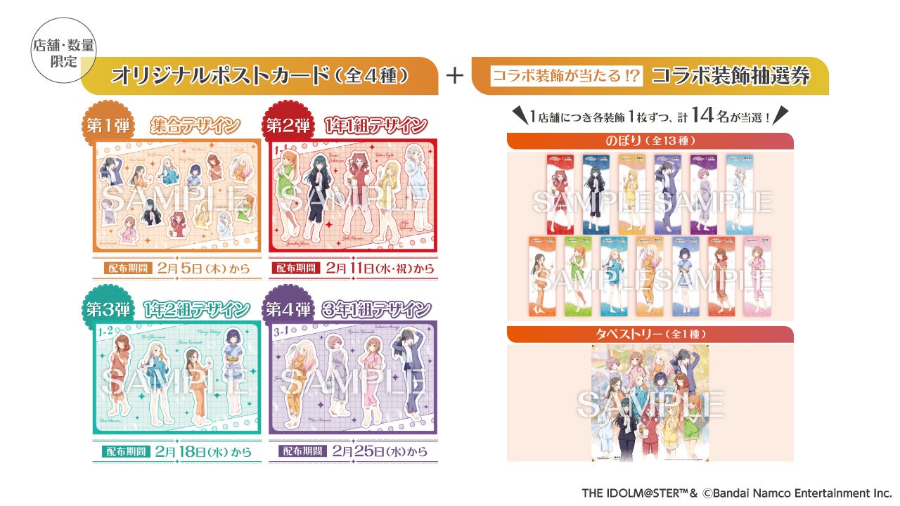 開催店舗ではアイドル達のパネルやのぼり、タペストリー、ポスターがコラボ装飾として館内を彩ります。アイドルプロフィールポスターに記載されている二次元コードを読み取ると、アイドルたちと写真が撮れるフォトフレームが出現します。