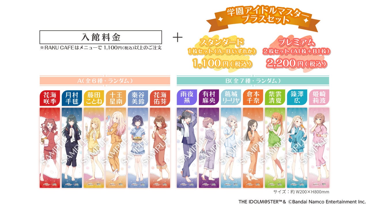 コラボ開催店舗入館時に、入館料金と「学園アイドルマスタープラスセット」をご購入いただいた方に、コラボ限定のマフラータオルをランダム(A:6種/B:7種)でお渡しします。