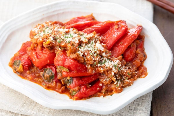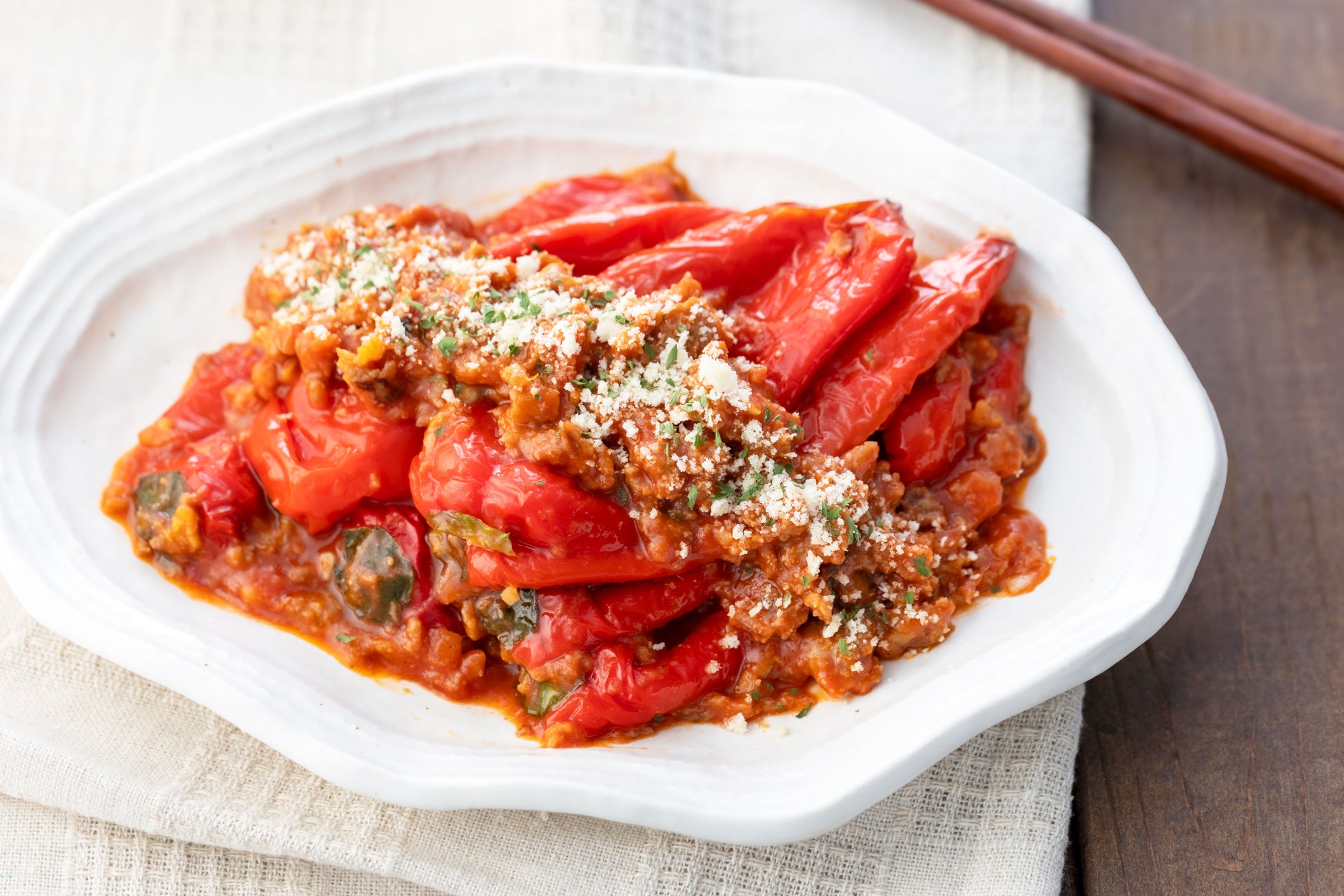 『ジャンボピーマン「とんがりパワー」のボロネーゼ風』は、「とんがりパワー」を、粗挽き肉やトマトのソースと合わせたボロネーゼ風の総菜です。甘くて大きい「とんがりパワー」を丸ごと使用し、見た目のインパクトも抜群。ピーマンの甘味に、肉の旨味とにんにくがきいたトマトのソースがよく合う、満足感のある一品に仕上げました。