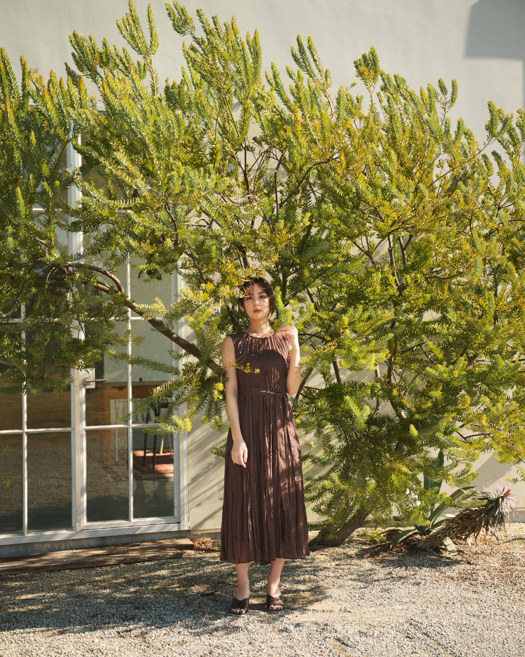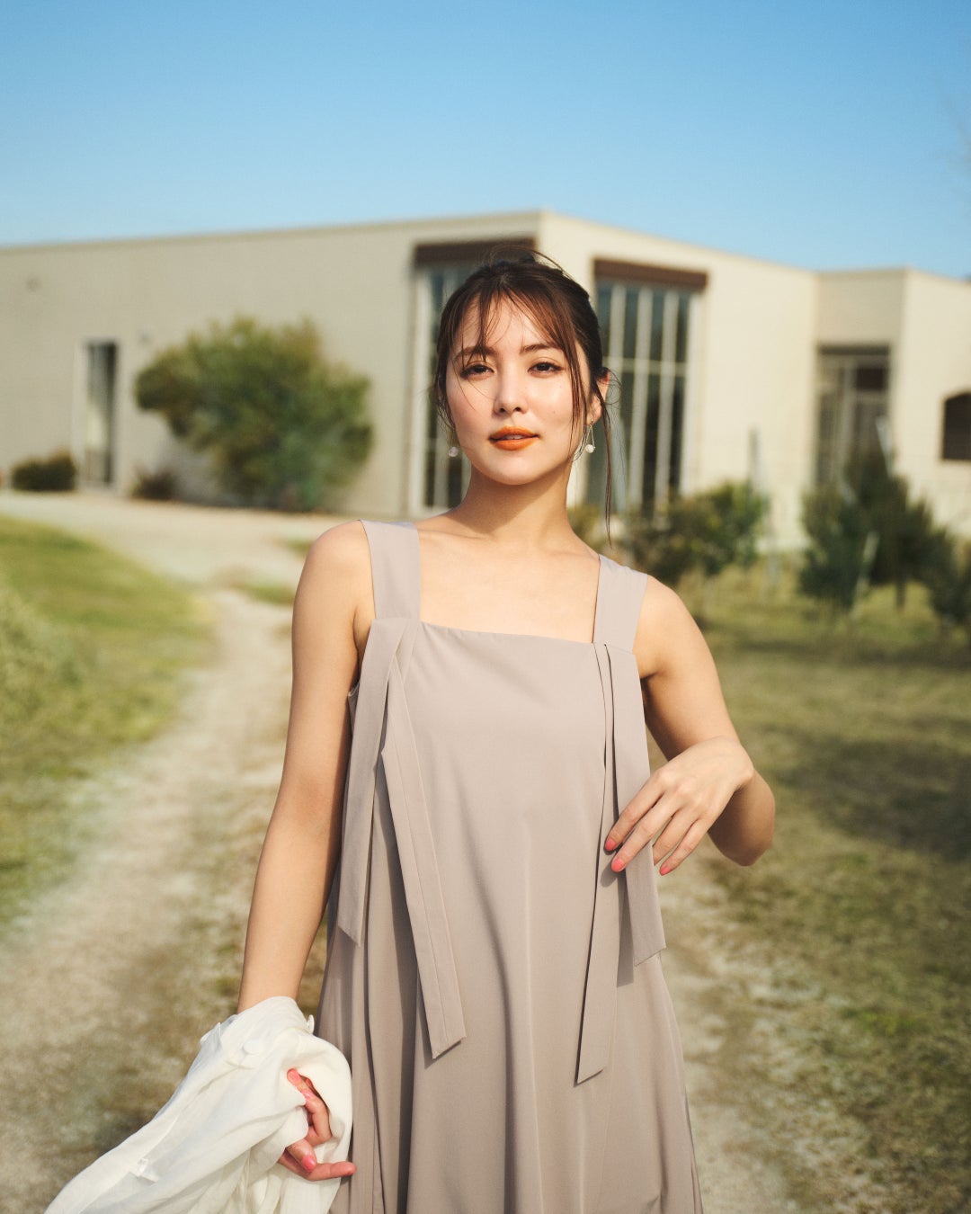 Dress ¥26,400 / Necklace ¥6,380 / Lariat ¥8,580 / Sandals ¥17,600