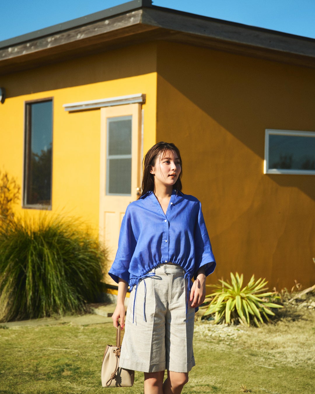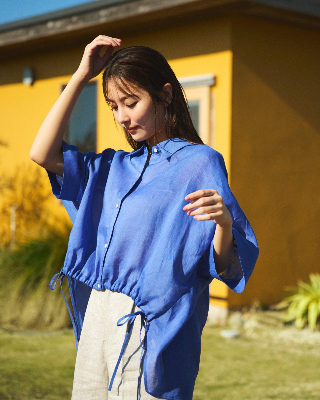 端正な仕立てのリネンシャツをヘムギャザーでヘルシーに