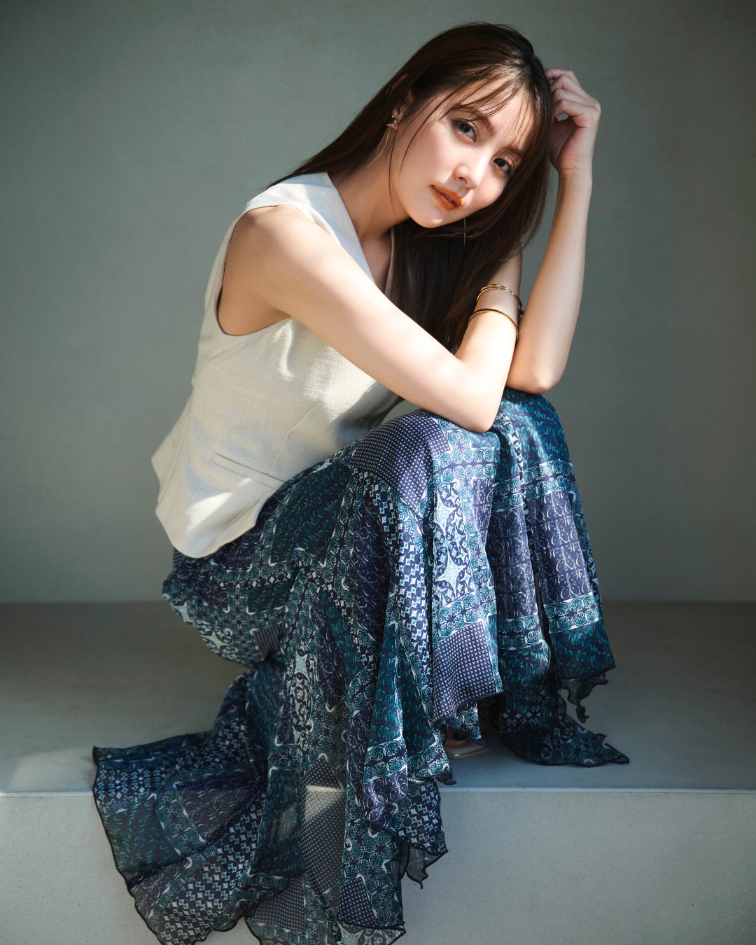 Vest ¥16,500 / Skirt ¥22,000 / Pierce ¥5,280 / Bangle Set ¥5,280 / Sandals ¥17,600