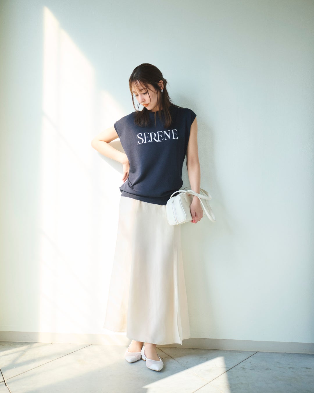 美シルエットの細見えニットにスポーティなロゴでイットなムードを
