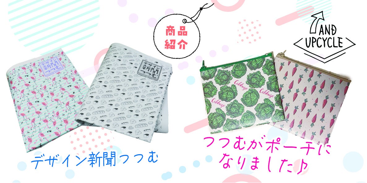 また、今回は企業・自治体向けアップサイクル監修やイベント企画やワークショップを開催する団体「アンドアップサイクル(代表:加藤恵子)」とコラボレーションし、新聞包装紙「つつむ」を素材に使用したオリジナルポーチを制作し、初めて販売します。「つつむ」の新たな使い方や、楽しみかたを感じて頂けます。アップサイクルによって生まれ変わった、日常で使える新聞紙雑貨をぜひ会場にてご覧ください。