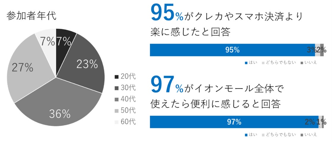 利用者アンケートでは、95%以上の方が「顔だけで買えるので、クレジットカードやスマホ決済よりも楽に感じた」「イオンモール全体で使えたら便利に感じる」と回答しており、さらに65%以上の方が「顔だけで買えるので、普段よりも財布の紐が緩んでしまった」と回答しています。