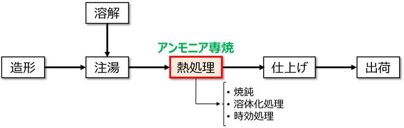 豊田自動織機東知多工場では、エンジンに使う鋳造部品を製造しており、多数の熱処理炉やアルミ溶解炉が稼働しています。本工場では、2050年のカーボンニュートラル達成目標に向け、CO₂排出量の削減が重要な課題となっています。一方、本工場が立地する愛知県の衣浦港周辺では、脱炭素燃料であるアンモニアの受入環境の整備が検討されています。こうした背景から、本工場ではアンモニア利用技術の探索を進めてきました。