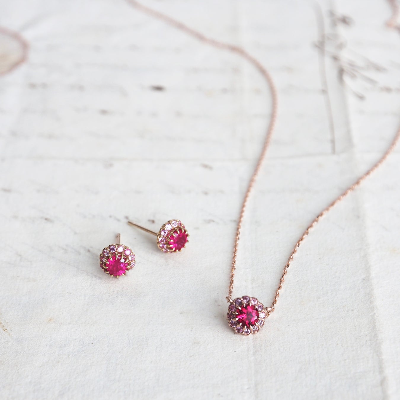 色とりどりのセンターストーンをメレダイヤで取り囲んだ、花のように可憐なデザイン。センターストーンの色合いを引き立てるため、一石一石選び抜いたメレを組み合わせ、一本ごとに唯一無二の表情を生み出しています。サイズは10mm・8mm・6mm・4mmの4種類をご用意。大粒サイズ(10mm・8mm)は透明感と迫力ある輝きを、6mm・4mmは可憐さと軽やかさを楽しめます。同デザインのピアスやネックレスも展開し、指先・耳元・首元のトータルコーディネートが可能です。