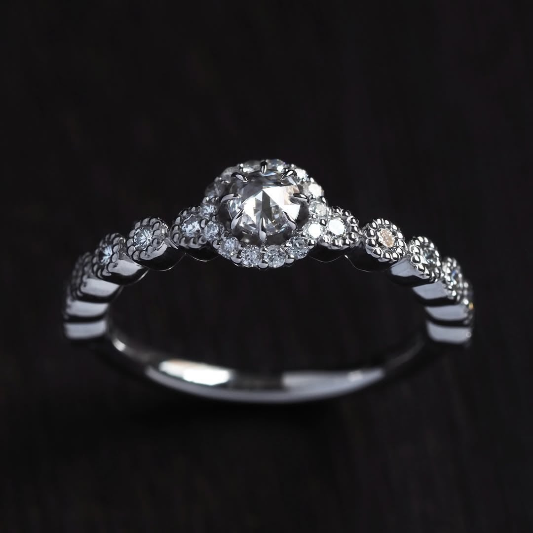 中心のマーキースを取り囲むのは、繊細なミルグレインと細やかな彫り留め。小さな宝石箱のように、胸元や指先で光をはじきます。石座の高さ、地金の厚み、側面の透かし──いずれも快適な着け心地と強度を両立させるために設計。爪は目立たないように仕立て、透かしは光を最大限に引き込みながらも、正面からは見えない軽やかさを添えています。