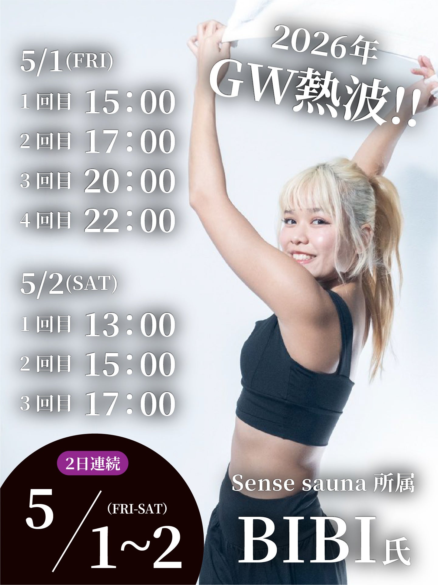 5月1日から4日にかけ、サウナ界で注目を集める熱波師が日替わりで登場。計算し尽くされたタオルワークと熱波の共演をお楽しみいただけます。