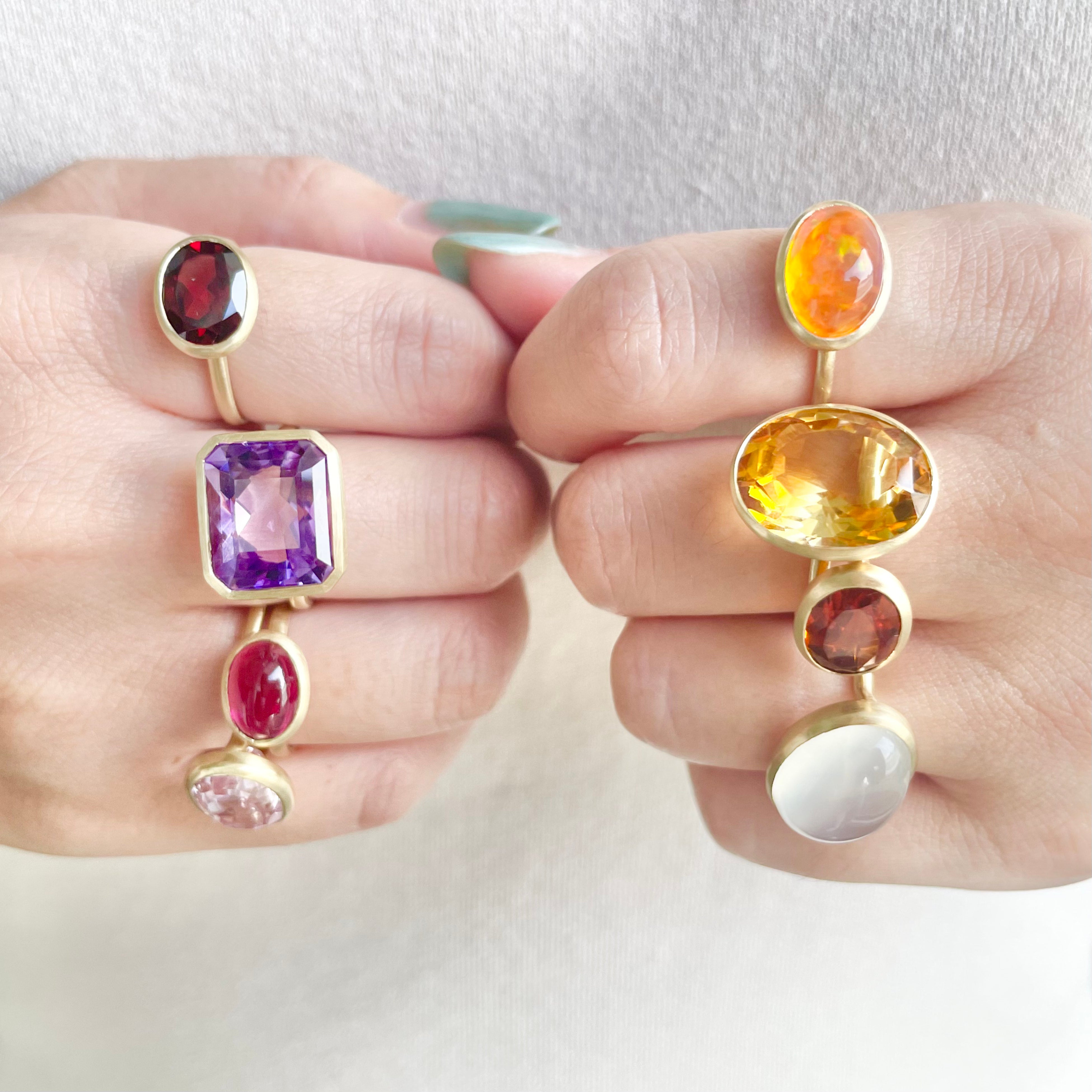 コロッとした大粒の天然石をのせたデザインが主役級の存在感を放つドロップリングと
