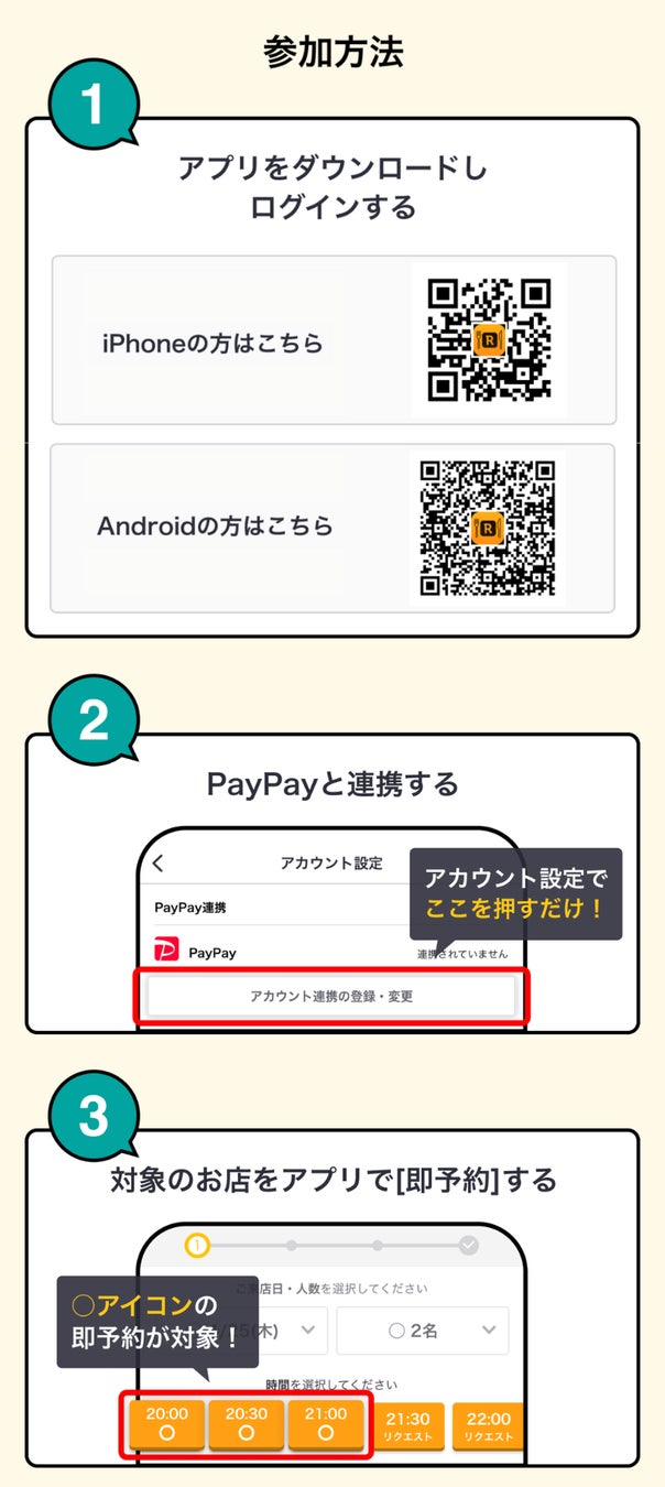 ・キャンペーン期間内にRettyアプリでネット予約(即予約)をして来店した方 ・RettyアカウントとPayPayアカウントを連携している方 |