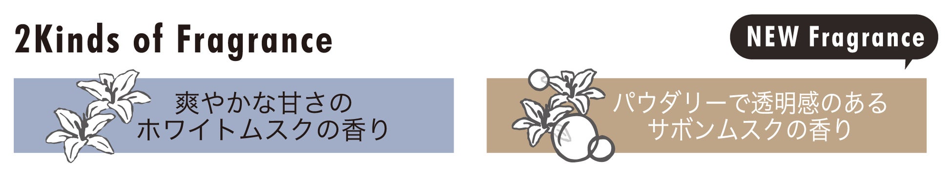 ブランドを代表する『WHITE MUSKの香り』に加え、『パウダリーで透明感&清潔感を感じるSAVON MUSKの香り』が新登場しました。衣類にやさしく香り付けして、ふとした瞬間にやわらかく香り立ちます。