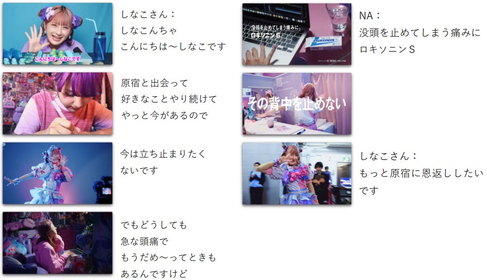 今回のWEB-CMは、原宿を拠点に自分の「好き」に真っすぐに、挑戦を続けるしなこさんの姿に迫ったドキュメンタリー形式の動画となっています。表舞台で活躍を続ける裏で、ひたむきに努力を重ねるしなこさんのように、やりたいことに没頭する人々の「夢中になる背中」を止めてしまう痛みに、速くよく効く「ロキソニンS」が寄り添いたいとの願いを込めて制作しました。