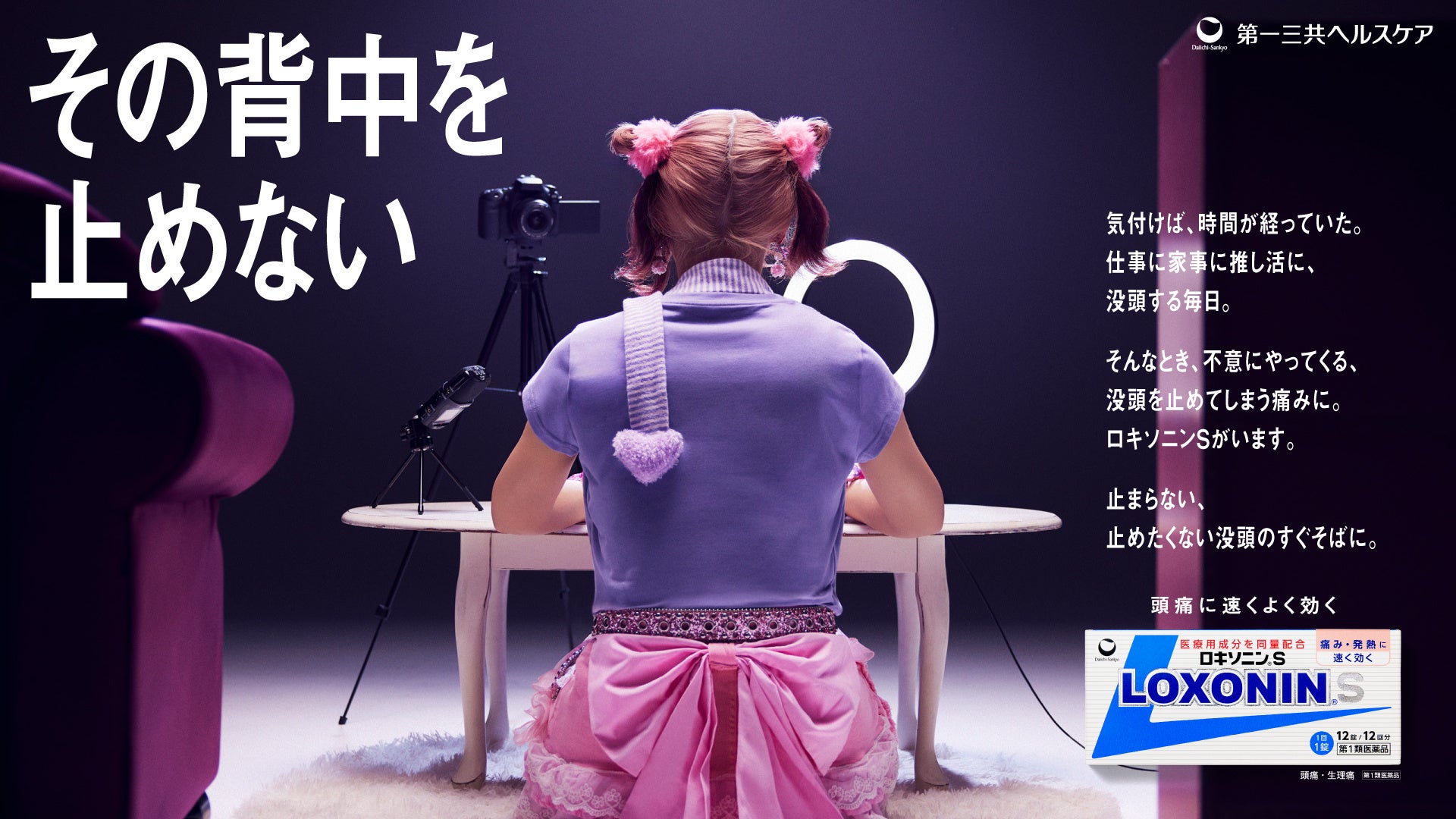 YouTubeの動画制作や自身がプロデュースする店頭での活動、アーティストとしてのステージ出演など、多方面で挑戦を続けるしなこさん。華やかな表舞台の裏で没頭する時間に不意にやってくる頭痛に「ロキソニンS」がそっと寄り添います。前向きに走り続けるしなこさんの「夢中になる背中」にぜひご注目ください。