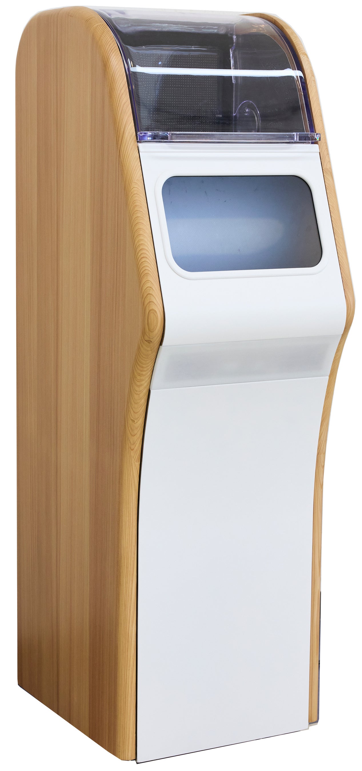 かつてのマホービンの形状をイメージした曲線を取り入れ、サイドパネルには関西を代表するブランド木材「吉野杉」を使用。木造建築「大屋根リング」に象徴される万博会場にふさわしいデザインを目指しました。