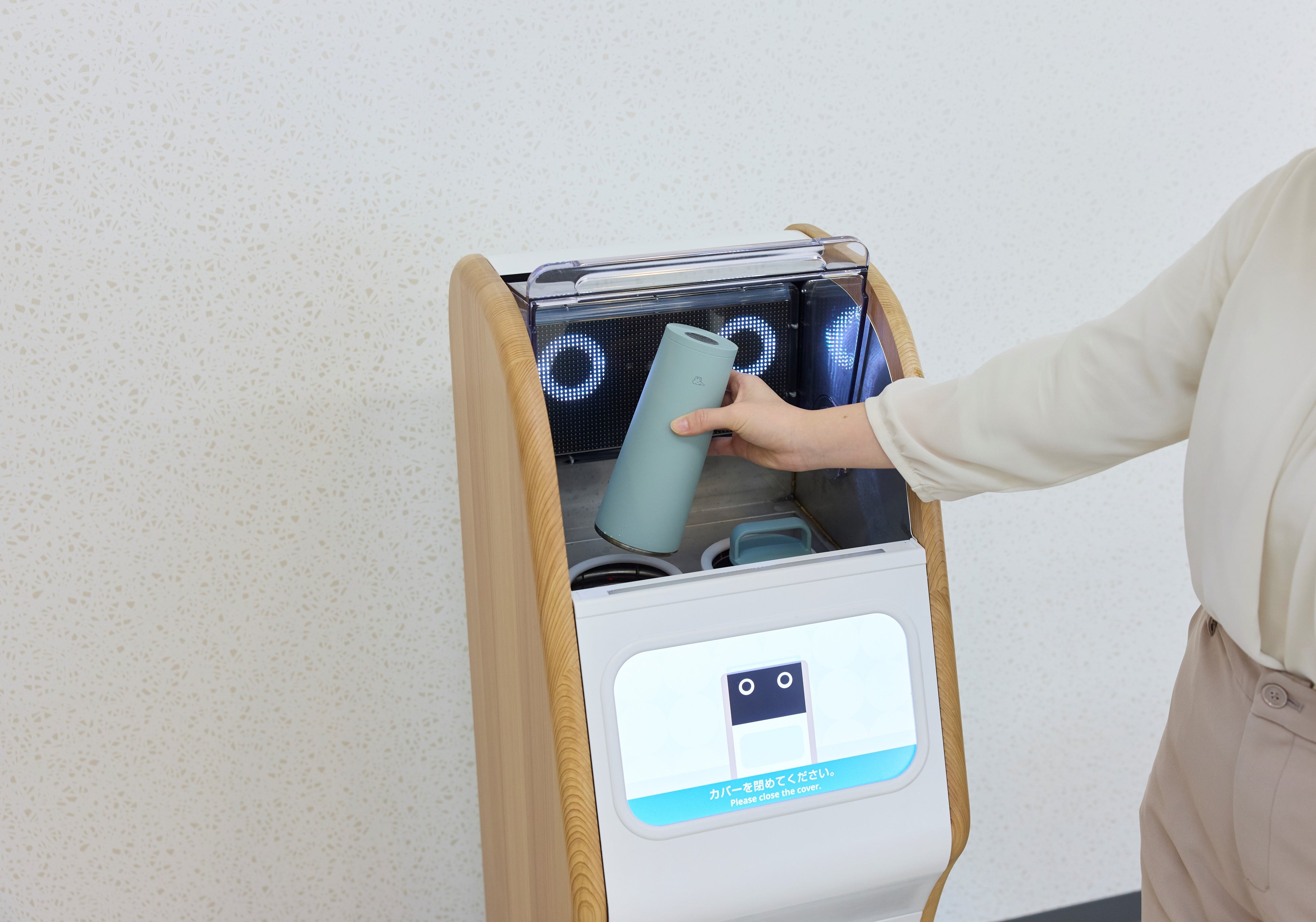 ひとや環境へのやさしさ、使い心地を大切にする当社のこだわりが詰まった「マイボトル洗浄機」。約20秒で洗浄・除菌ができます。洗浄完了後にマイボトルを取り出すと接地面が毎回洗浄されるので衛生的です。
