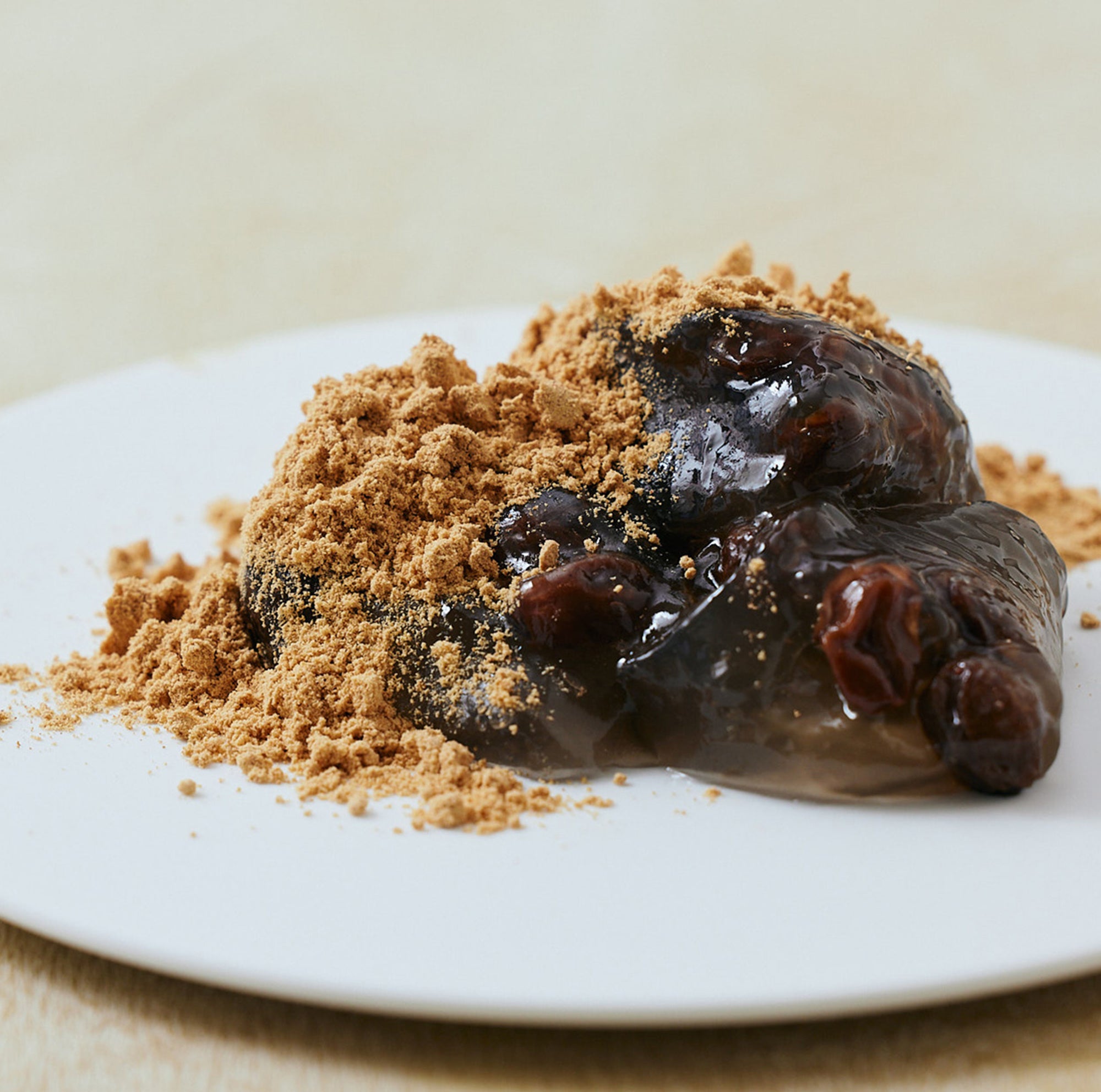 きな粉をまぶしたわらび餅の上にたっぷりとこしあんを絞りました。日本茶と一緒にたべたいわらび餅。