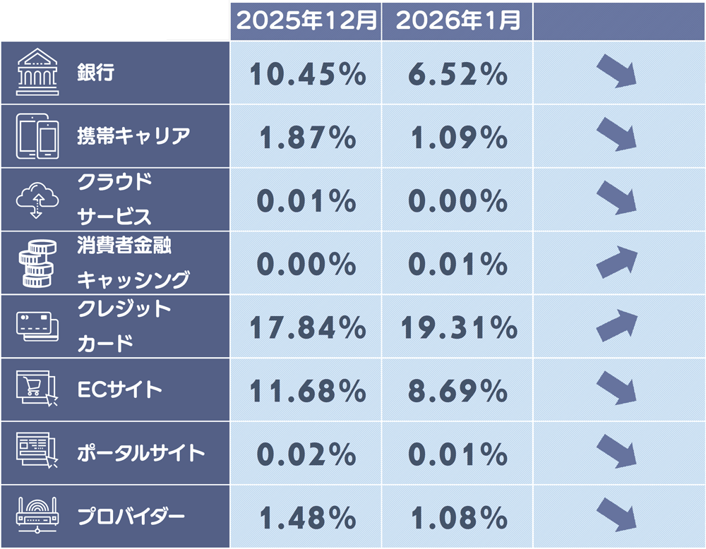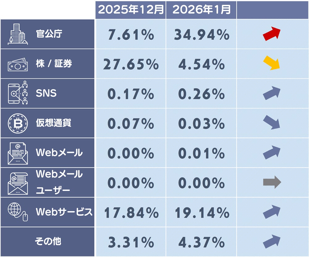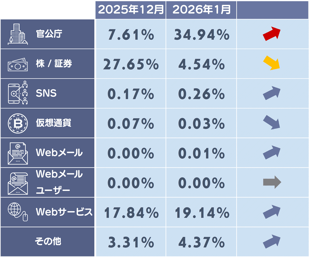 1月度は官公庁のフィッシングサイトの構成比が上昇しており、国税庁のフィッシングサイトが増加したことが要因と考えられます。また証券系のフィッシングサイトの減少により構成比が減少しています。