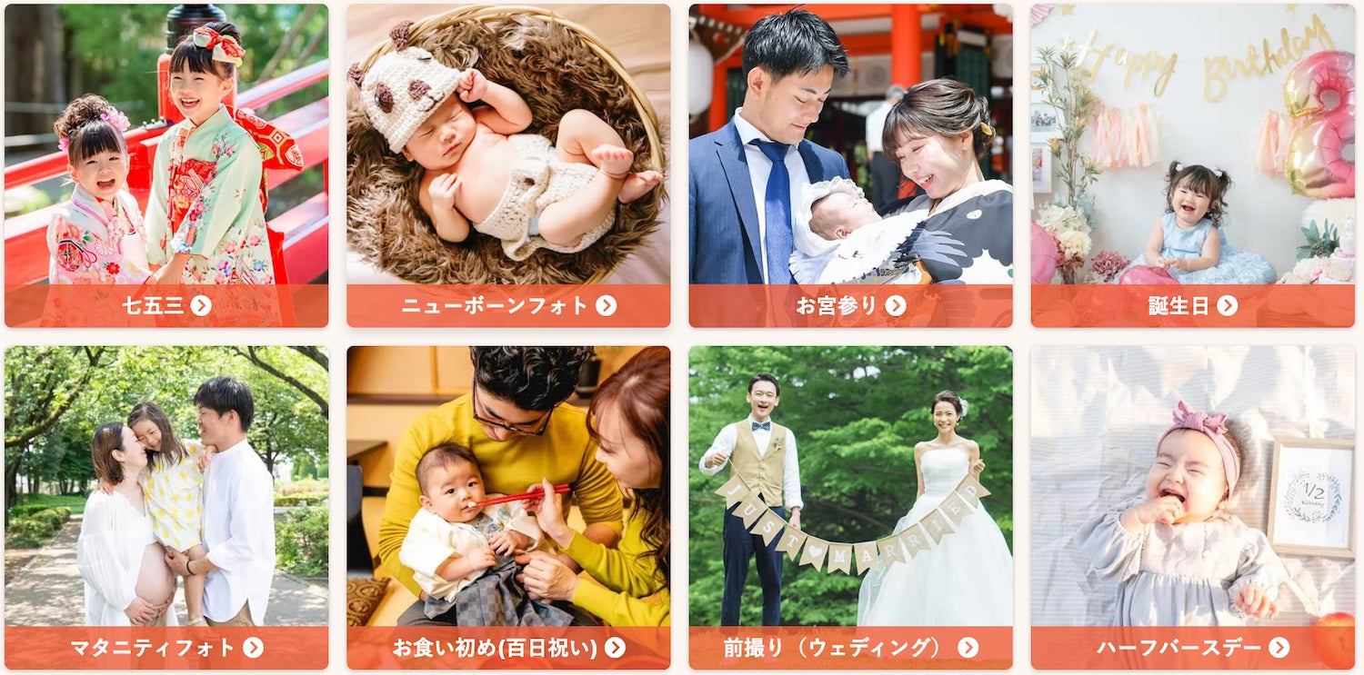 マタニティ、ニューボーン(新生児)、お宮参り、誕生日、七五三、卒入園・卒入学、成人式、結婚式の前撮り・後撮り、長寿祝いなど、ご家族の記念日はもちろん、日々の残したい愛おしさに寄り添う「わが家の専属フォトグラファー」として、全国のご家族にご利用いただいています。