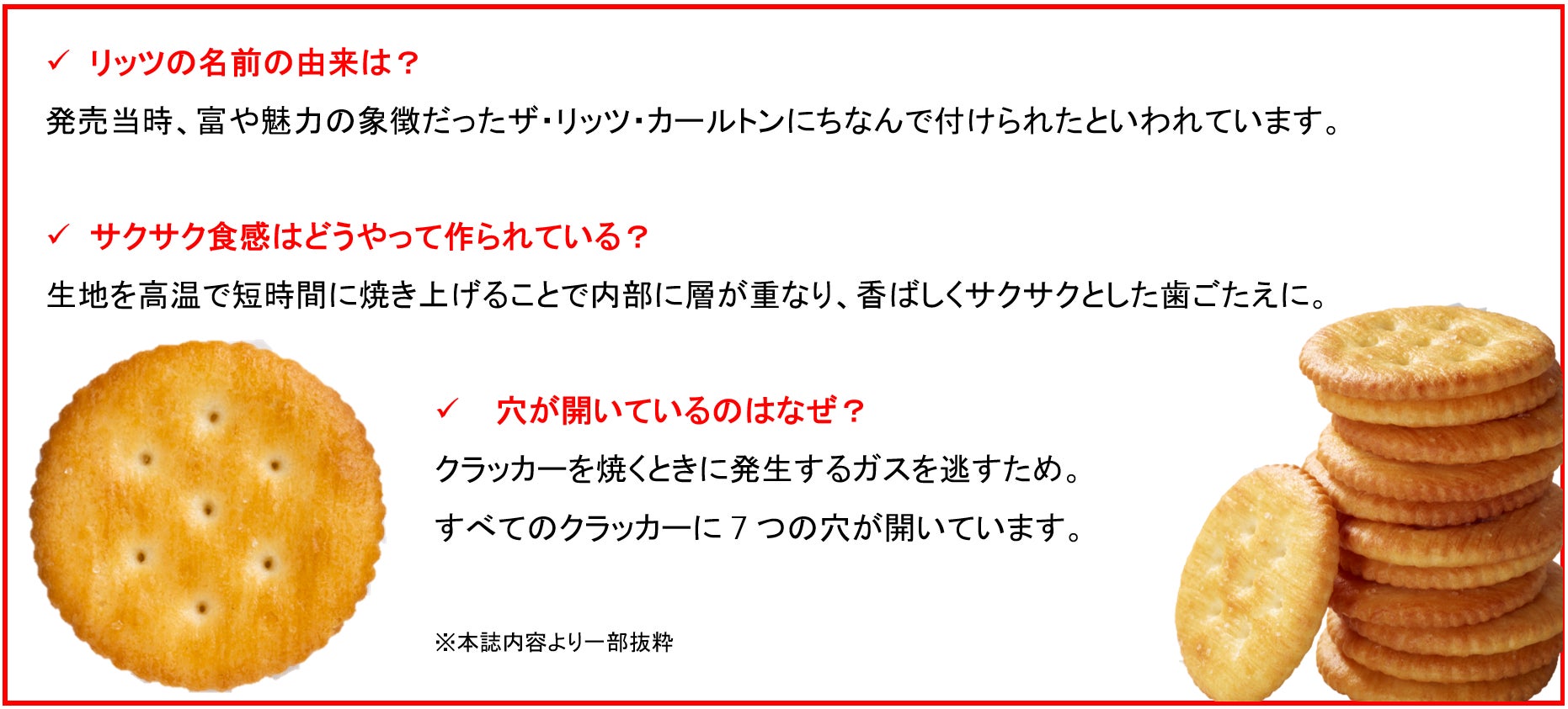 ふだんは何げなく食べているリッツ。ブランドブックには、その美味しさに関する知られざる豆知識が詰まっています。