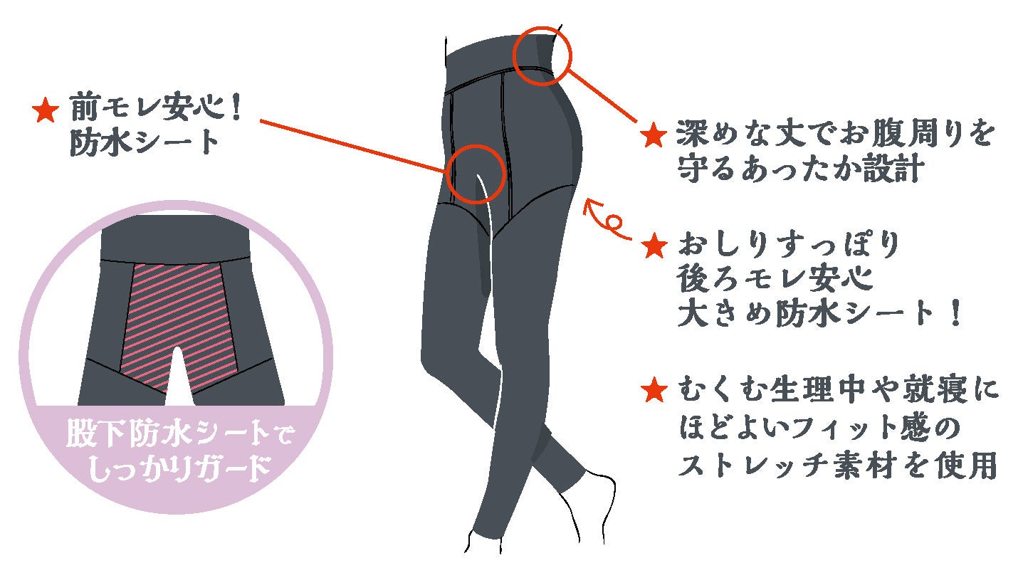 ○サニタリーショーツの上に履いてオーバーレギンス。昼夜問わず、経血モレから衣類・寝具を守る安心設計。