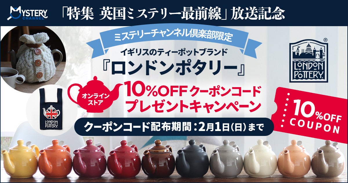 1月のミステリーチャンネルは、英国ミステリーの最新人気ドラマを大特集!これにちなみ、ミステリーチャンネル倶楽部会員の皆様へ日頃の感謝を込めて、イギリスのティーポットブランド『ロンドンポタリー』オンラインストアでのお買い物がお得に楽しめるクーポンコードをプレゼント!
