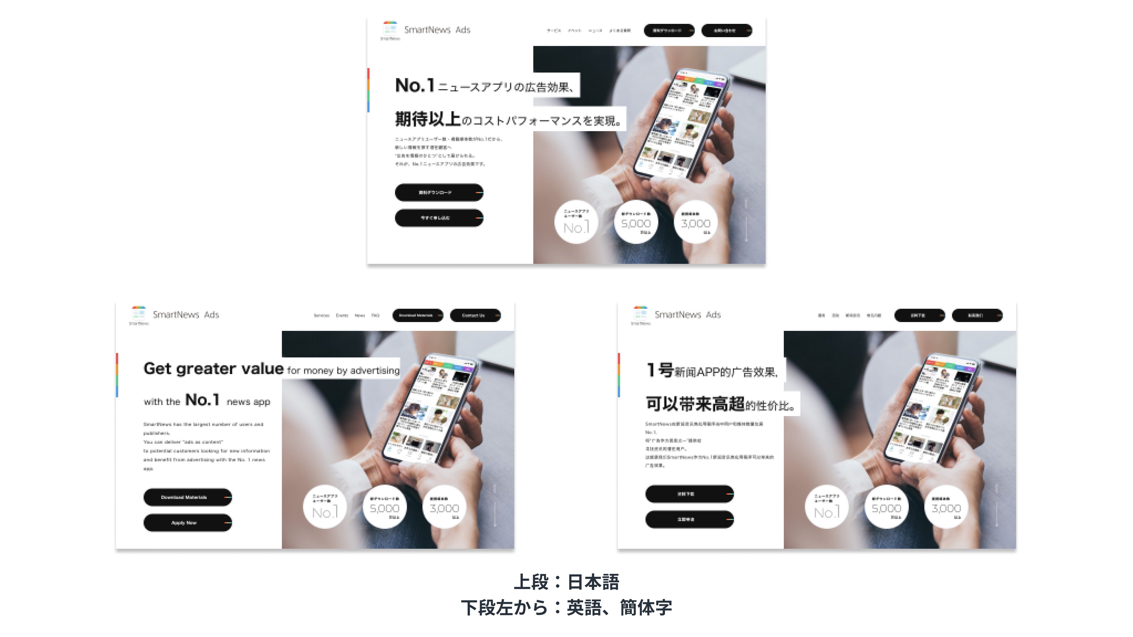スマートニュースの広告サービスサイトに WOVN.io を導入し、英語、簡体字で表示しております。スマートニュースアプリに広告出稿を希望する企業様に、サービス概要やイベント情報、ニュースなどをリアルタイムに届けることで、サービスの魅力を届けています。