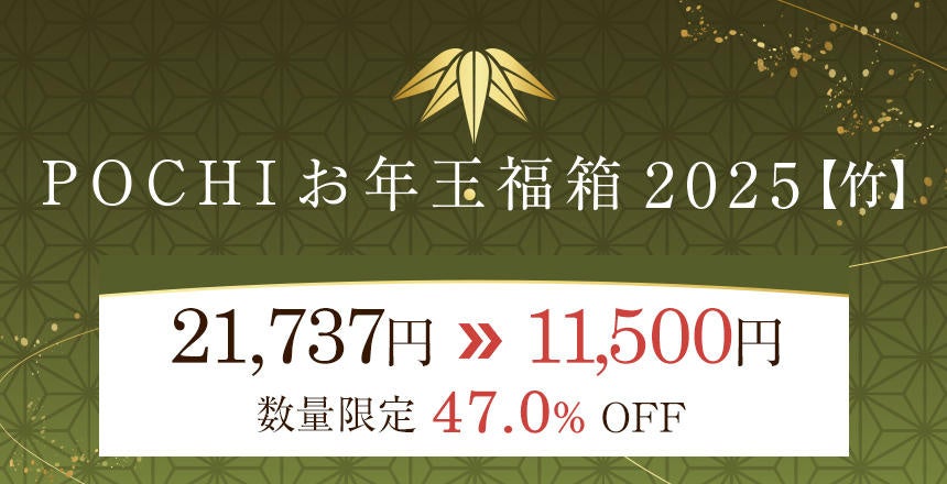 プレミアムドッグフード専門店・通販「ポチの幸せ(POCHI)」(運営:マーケティングパートナー株式会社、本社所在地:東京都新宿区、代表取締役社長:権田真司、Tel:03-6772-8194、https://www.pochi.co.jp/)は、「お年玉福箱2025」を12月10日より販売開始しました。「松」「竹」「梅」の3種類で、最大47.5%オフとなるお得なセット商品です。(数量限定品のため、リリース時に完売している場合があります。ご注意ください。)
