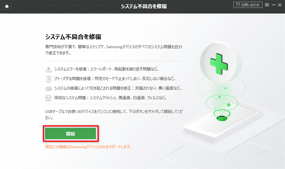 1.パソコンでDroidKitを開き、ホーム画面で「システム不具合を修復」を選択します。Galaxyをパソコンと接続して「開始」ボタンをクリックします。