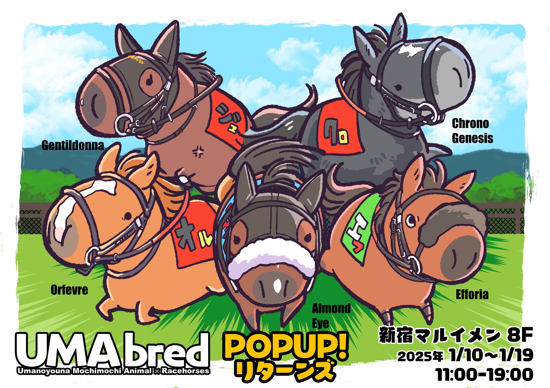 2025年1/10(金)より、実在の競走馬・引退馬を「UMA」(ウマのようなモチモチアニマル)として書き下ろすグッズブランド「UMAbred」のPOPUPイベントを、東京都新宿マルイ メン 8F にて「UMAbred POPUP!リターンズ」として開催いたします。