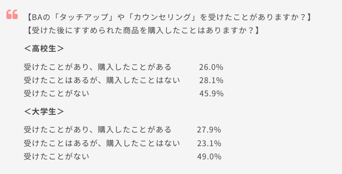 BAから「タッチアップ」や「カウンセリング」を受けた経験、受けた後に勧められた商品を購入した経験を聞いたところ、「受けたことがあり、購入したことがある」と回答した人は、高校生は26.0%、大学生は27.9%となりました。