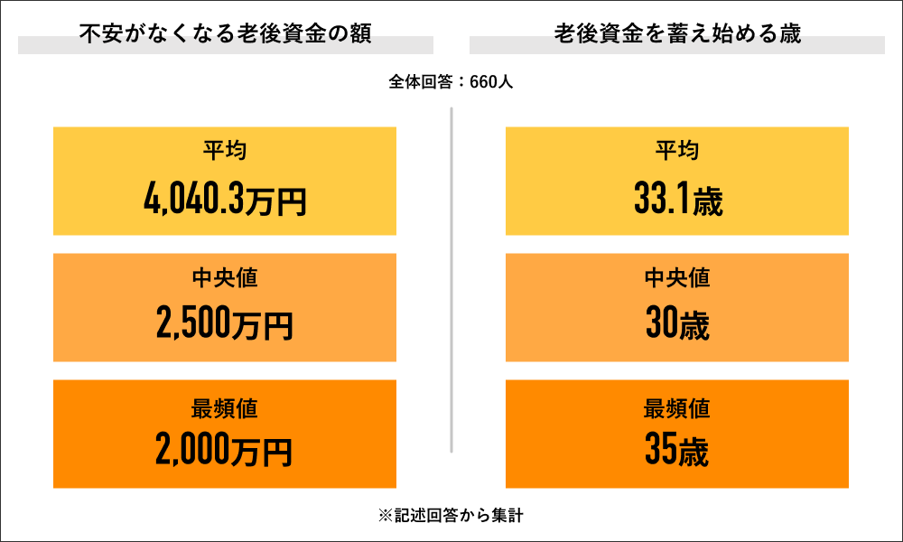 回答者全体の660人に不安がなくなる老後資金の額を記述回答にて聞くと、平均額は4,040.3万円、中央値が2,500万円、最頻値が2,000万円となりました。同回答者に老後資金を蓄え始める歳を記述回答にて聞くと、平均は33.1歳、中央値が30歳、最頻値が35歳となりました。