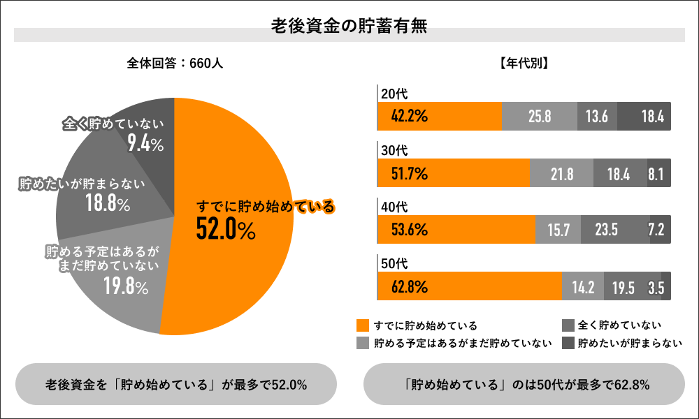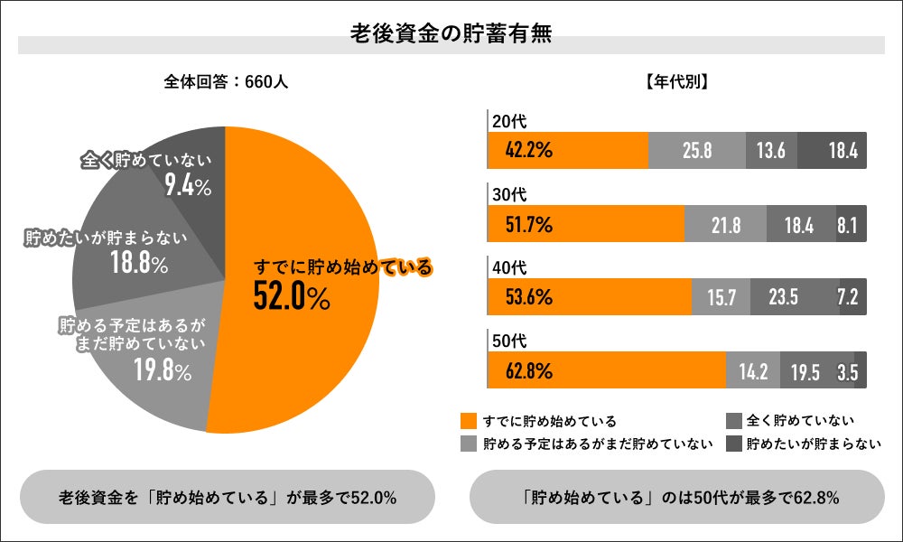 回答者全体の660人に老後資金の貯蓄有無を聞くと、「貯め始めている派」が52.0%で過半数を占め、「貯めていない派」は48.0%でした。年代別の回答では50代の「貯め始めている派」が62.8%で最多となり、次いで40代が53.6%、30代が51.7%、20代が42.2%と、年代が上がるほど貯蓄者割合が高まる結果になりました。