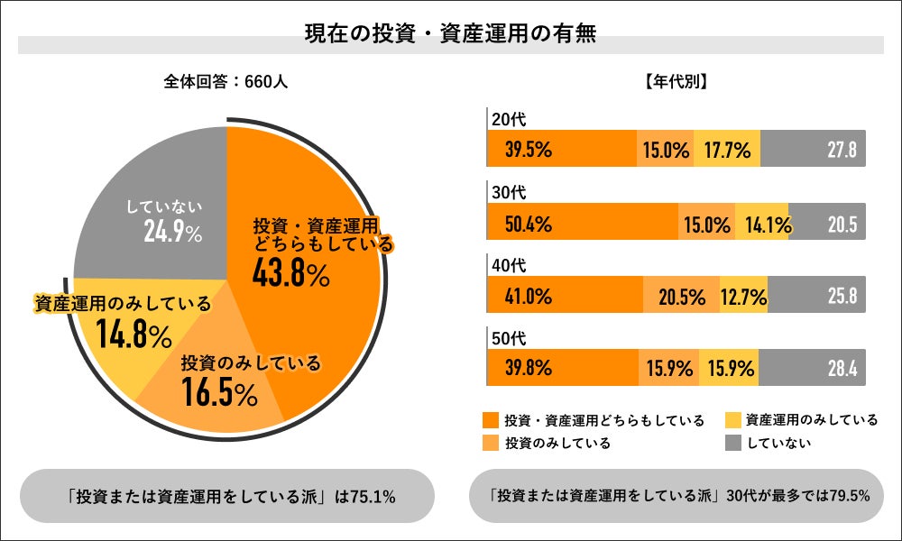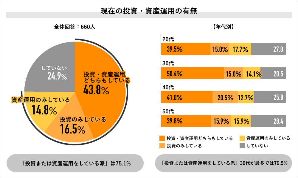 回答者全体の660人に現在の「投資・資産運用」の有無を聞くと、いずれかを「運用している派」が75.1%で過半数を占め、内訳は「投資・資産運用どちらもしている」が43.8%、「投資のみしている」が16.5%、「資産運用のみしている」が14.8%でした。年代別の回答では30代の「運用している派」が79.5%で最多となり、次いで40代が74.2%、20代が72.2%、50代が71.6%の結果になりました。