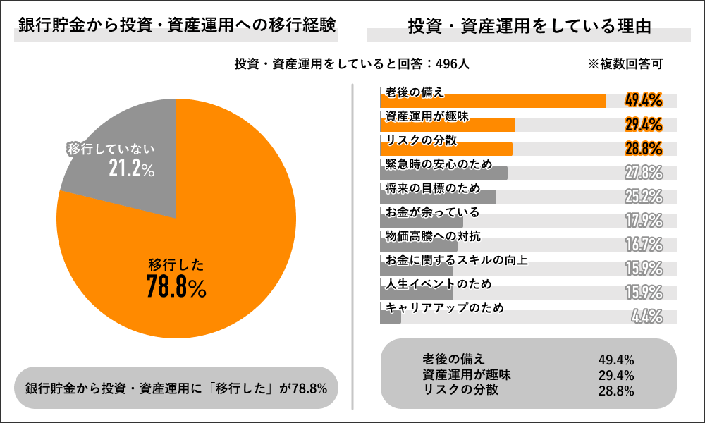 投資・資産運用をしていると回答した496人に銀行貯金から投資・資産運用への移行経験を聞くと、「移行した」が78.8%で過半数を占め、「移行していない」は21.2%でした。同回答者に運用理由を聞くと「老後の蓄え」が49.4%で最多となり、次いで「資産運用が趣味」が29.4%、「リスクの分散」が28.8%と、上位3つの回答となりました。