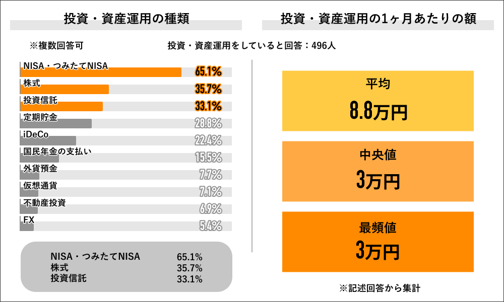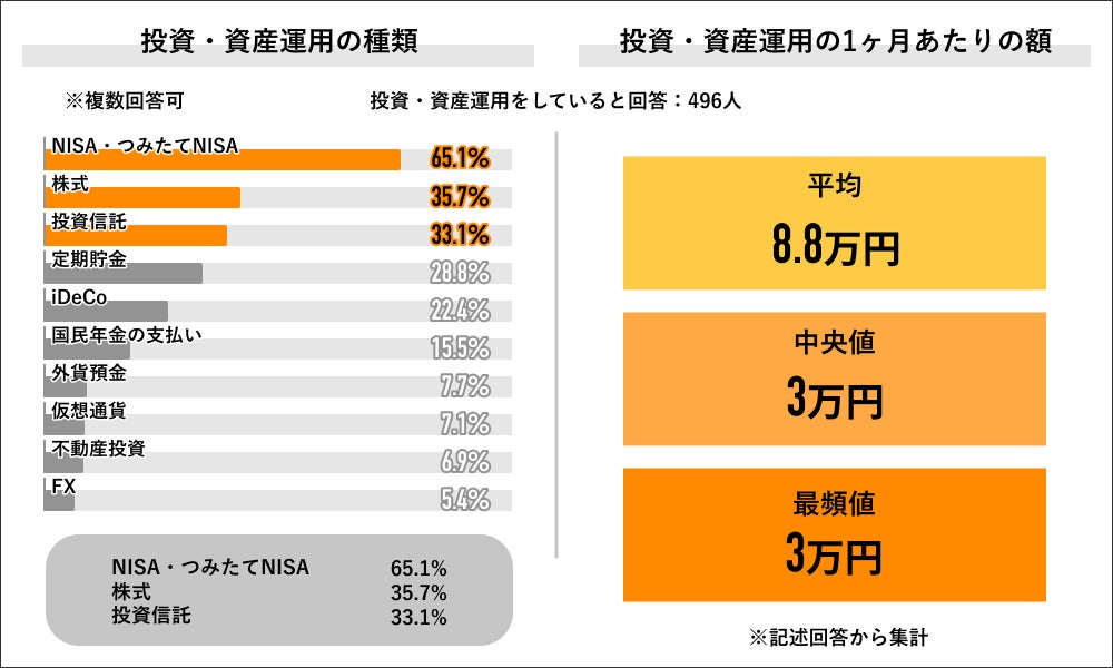 現在投資・資産運用をしていると回答した496人に運用の種類を聞くと、「NISA・つみたてNISA」が65.1%で最多となり、次いで「株式」が35.7%、「投資信託」が33.1%と上位3つの回答となりました。同回答者に1ヶ月に投資・資産運用に回す額を記述回答にて聞くと、平均が8.8万円、中央値が3万円、最頻値が3万円となりました。