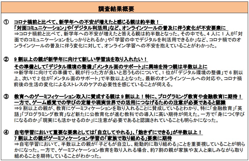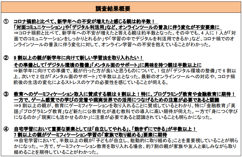 新学年ならびに教育のゲーミフィケーションに関する意識調査「ゲーミフィケーション」教育の導入に、興味を示す親は9割以上!必修化教科への導入を期待する一方で、現実世界での活用につなぐための注意が必要
