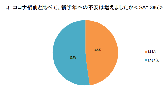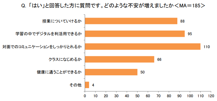 「コロナ禍前と比べて、新学年への不安は増えましたか<SA>」の問について、「はい」(185)が約半数となりました。中でも、「はい」と回答した人を対象とした、「どのような不安が増えましたか<MA>」の問では、4人に1人が「対面でのコミュニケーションをしっかりとれるか」(110)、「学習の中でデジタルを利活用できるか」(95)と回答しており、コロナ禍によるオンラインツールの普及に伴う変化に対して不安を抱えていることがわかりました。