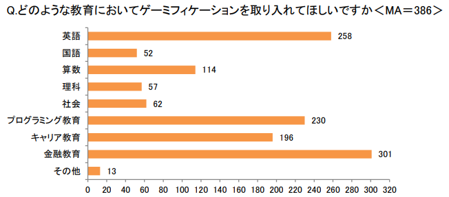 「教育にゲーミフィケーションを取り入れることに賛成ですか<SA>」の問に対し、9割以上が「はい」(373)と回答し、非常に多くの親がゲーミフィケーションの導入に賛成していることがわかりました。また、「どのような教育においてゲーミフィケーションを取り入れてほしいですか<MA>」の問では、「金融教育」(301)が7割以上で1位となりました。次いで2位が「英語」(258)で6割以上、3位が「プログラミング教育」(230)で半数以上の回答を集めました。このことから、教育での必修化が進む項目に対して、特にゲーミフィケーションの導入を期待する親が多いことがわかりました。