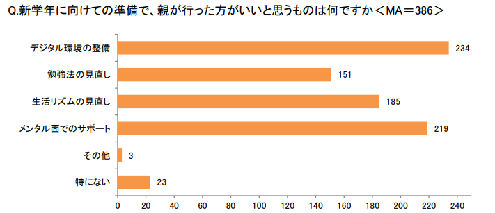 「新学年に向けて、新しい学習法を取り入れたいと思いますか<SA>」の問では、「はい」(373)と回答した人が9割以上となり、家庭学習でも新しい学習方法の導入の必要性を感じていることが明らかになりました。さらに、「新学年に向けての準備で、親が行った方がいいと思うものは何ですか<MA>」の問では、「デジタル環境の整備」(234)との回答が6割以上で最も多く、続いて「メンタル面のサポート」が半数以上となりました。この結果から、新学期の準備として、コロナ禍を機に普及が進む最新のオンラインツールへの対応や、コロナ禍前後の生活の変化によるストレスのケアの必要性を感じていることが伺えます。