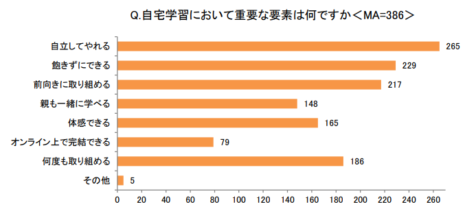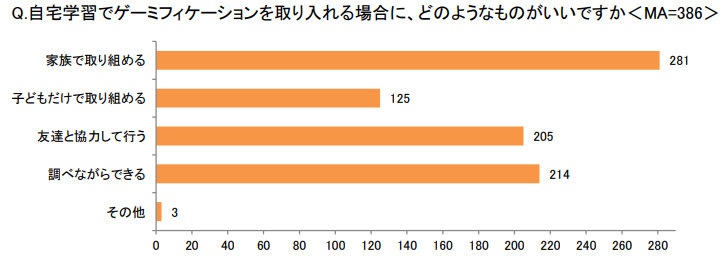 「自宅学習において重要な要素は何ですか<MA>」の問では、「自立してやれる」(265)が7割以上となり、続いて6割近くが「飽きずにできる」(229)と回答しました。さらに、「自宅学習でゲーミフィケーションを取り入れる場合に、どのようなものがいいですか<MA>」の問について、「家族で取り組める」(281)が約7割で最も多い結果となりました。このことから、自宅学習においては、子どもが自立し、能動的に取り組める要素を重要視している一方で、ゲーミフィケーション教育の家族と楽しみながら取り組める点に期待する親が多いことがわかります。